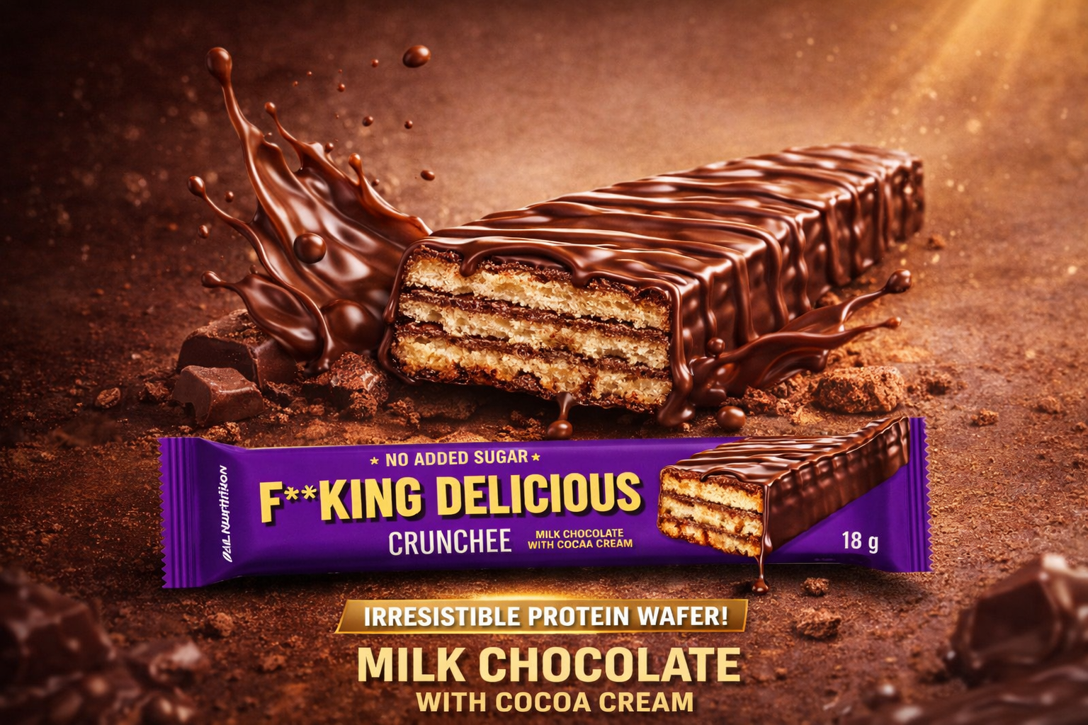 F**KING DELICIOUS CRUNCHEE is een smakelijke eiwitwafel met een knapperige structuur gecombineerd met een romige cacaovulling en een laag melkchocolade dankzij het gebruik van zoetstoffen kun je genieten van een zoete smaak zonder toegevoegde suikers perfect als snelle snack gedurende de dag of na de training