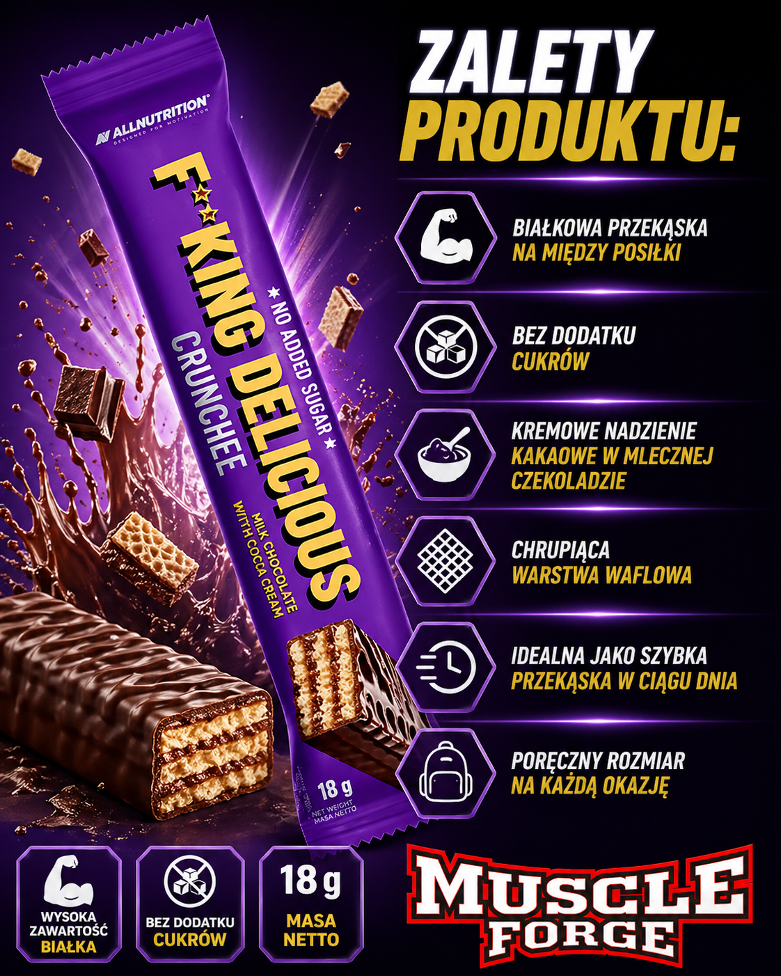 ALLNUTRITION F**KING DELICIOUS CRUNCHEE Protein Wafer to smaczny wafelek białkowy o chrupiącej strukturze połączonej z kremowym kakaowym nadzieniem i warstwą mlecznej czekolady 🍫