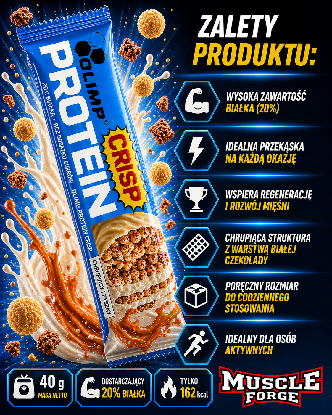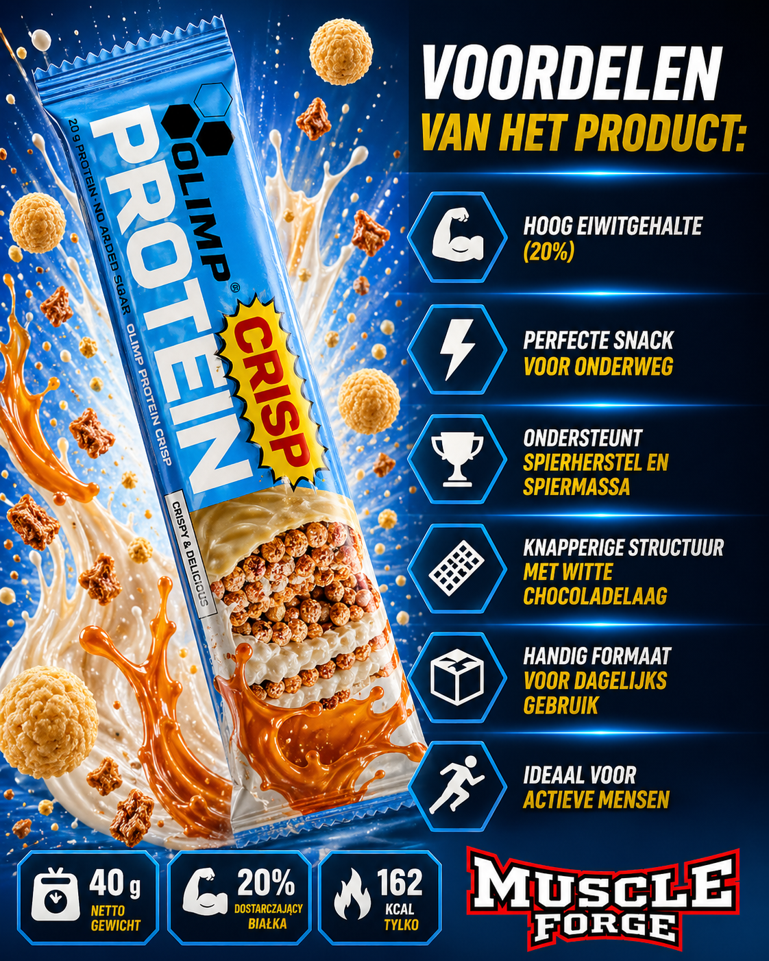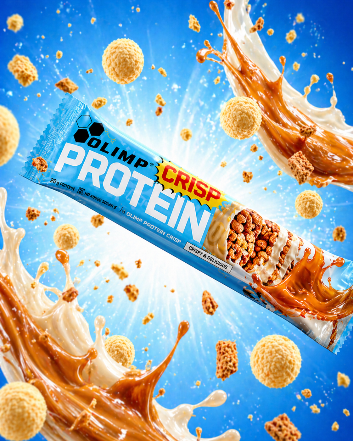 OLIMP PROTEIN CRISP BAR is een knapperige eiwitreep met een heerlijke witte chocoladelaag, ideaal als snelle snack gedurende de dag 💊